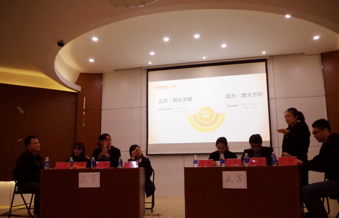 首先在预赛环节,四支代表队分成两组,分别就“双十一购物是否利大于弊”和“是否感恩生活的暴击”两个辩题进行两两比拼,辩手们进行了激烈的交锋。在第一轮中,正反双方以刚过去的双十一活动为出发点,从理性消费、物流发展等多个角度开展辩论。反方二辩更是拿历年双十一购物的现实数据说话,不但使“双十一购物弊大于利”的观点更具说服力,同时也给了正方辩友沉重的一击。在第二轮中,同样也是反方阵营,将最近社会热点“江歌事件”和辩题结合,以此为例,直接有力地论证“我们怎么可能会感恩生活的暴击”这一观点。场上辩手们用不同方式、从多种角度来支持己方观点,并抓住对方的漏洞,准确得予以回击和质疑,可谓是妙语连珠、精彩绝伦,而观众们不时响起的掌声更是将气氛一次次推向高潮。在一番激烈的唇枪舌战后,两组队伍脱颖而出,顺利进入决赛环节。